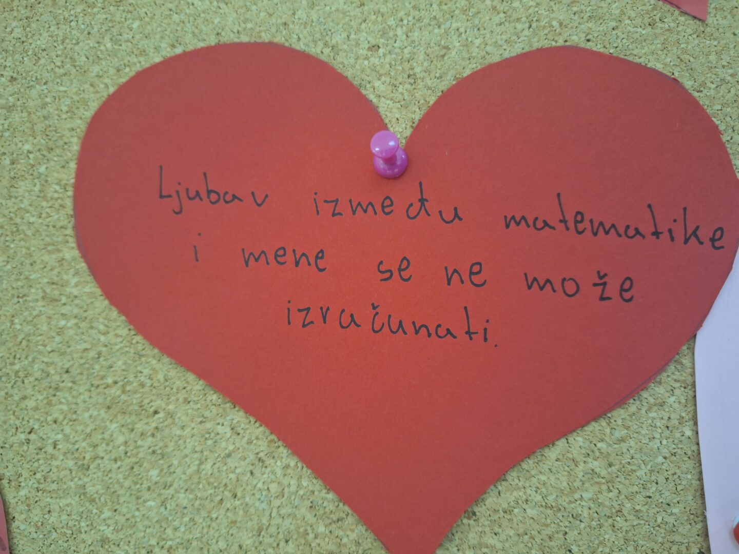 U Valentinovskom tjednu učenici 6.c razreda na satu matematike odigrali su matematički Escape room. Igra kaže da je na Valentinovo nestala Formula ljubavi! Zločesti doktor Djeljivko zaključao ju je u sef s pet znamenki. Da bi spasili Valentinovo učenici su morali riješiti 5 matematičkih izazova te na taj način doći do peteroznamenkastog koda koji otključava sef. Učenici su na zabavan način uvježbali sadržaj Djeljivost i razlomci te spasili Valentinovo. Učenici 6.a, 6.b i 6.c razreda prigodno su ukrasili pano ispred matematičke učionice na temu Ljubav i matematika. Učenici su izrezivali srca te u njih upisivali stihove na zadanu temu. Neke od stihova pročitajte u nastavku.