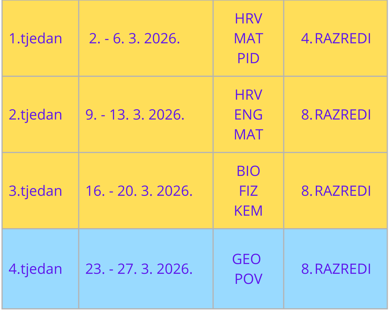 Dakle, od 2. 3. tri tjedna vrijedit će raspored za žuti turnus, a zadnji tjedan prije uskrsnih praznika vrijedit će raspored za plavi turnus.