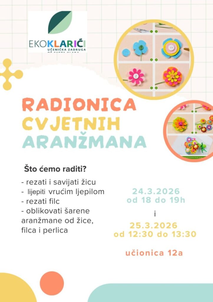 Poštovani roditelji, dragi učenici,tjedan od 23. do 27. ožujka 2026. posljednji je tjedan nastave prije uskrsnih praznika i nastava se održava prema rasporedu za PLAVI TJEDAN. U petak, 27. 3. 2026. nastava je skraćena zbog tradicionalnog Uskrsnog sajma koji će se...